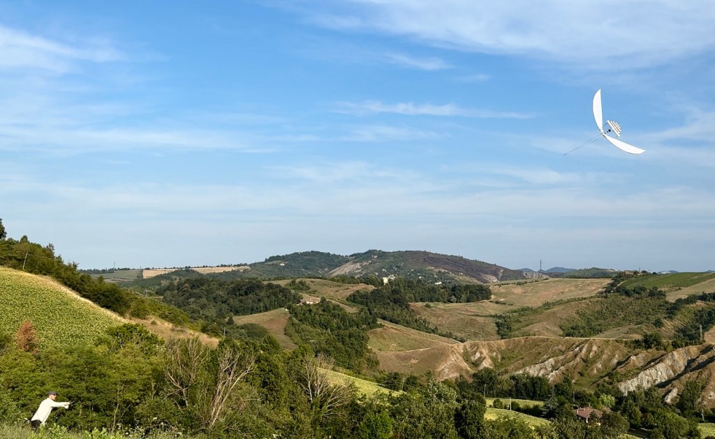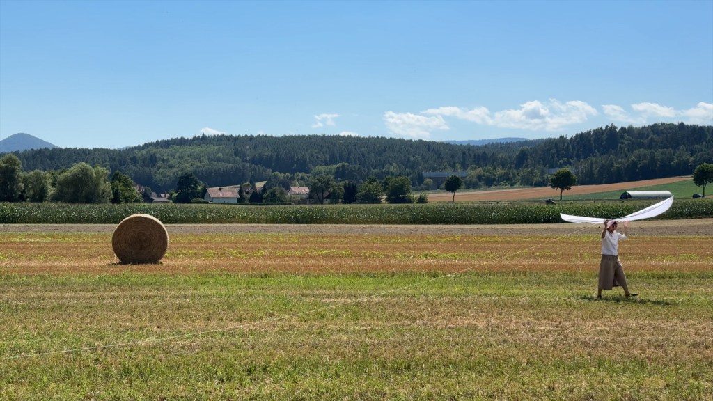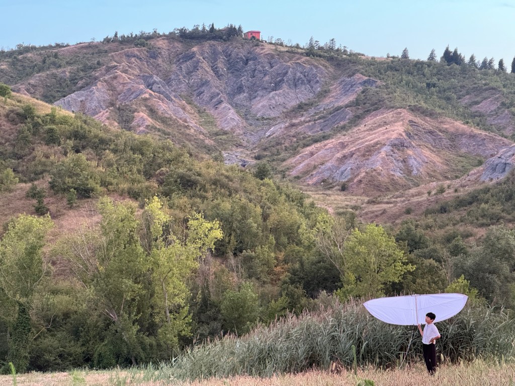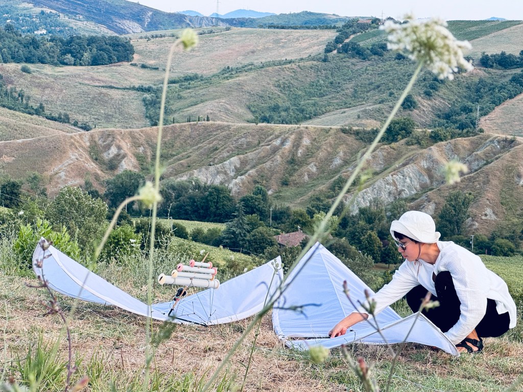 We wanted our kite to have its own journey, to see it soar in different places as we ventured on our way to the residency in Bologna. We made the first stop in Türkensturz, a ruin where, according to legend, a group of Turkish raiders once fell from the cliffs.The day was crystal clear, the sky a brilliant blue. The air hung motionless, dry and cool, but the midday sun blazed with an unforgiving heat. As we walked through the fields to retrieve the fallen kite, we could hear the crunch of sun-dried wheat stubble under our feet.Every day, we checked the weather forecast, hoping for stronger winds during our stay in Bologna. Last Saturday, the forecast hinted at a breeze around 5 pm, so we took our two biggest kites and headed for the hills around Fienile Fluo. But just as we finished assembling them, the wind vanished, leaving us in stillness once more.Sunday brought better fortune. The sun was relentless, scorching the earth beneath it, while the wind teased us—appearing and disappearing, making the kite’s ascent a challenge. The longer we waited, the more precious the wind became.Finally, after many attempts, the kite soared, its flute singing a haunting melody in the quiet of the hills. The sky was its own, as few birds dared to fly in the midday heat, leaving the kite in solitary flight.By Monday, we sought an easier path, heading to the coast at Lido di Spina, where the winds are more faithful. After a long drive, we arrived and felt the relief of a steady east wind. The kite rose effortlessly, its flight so sure that we could tie it to a tree trunk and watch it dance in the sky.Two days before the Letter to Notos performance, we decided to test our idea of flying the kite on the hills behind the stage. The wind played with us, leaving us disappointed yet hopeful.Although we could not fly the kite as long as we had wished but we could hear the persistent hum of cicadas, the crunch of sun-dried wheat stubble beneath our feet as we walked through the fields to retrieve the fallen kite.