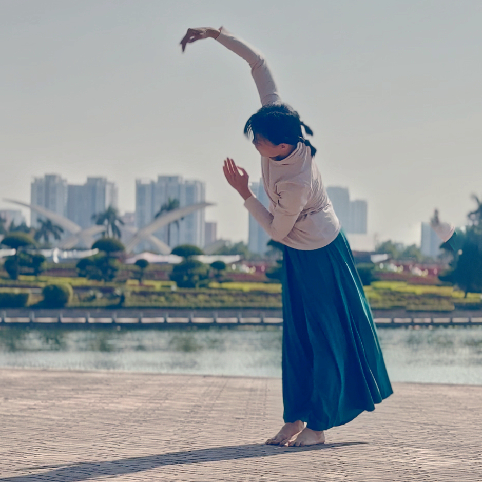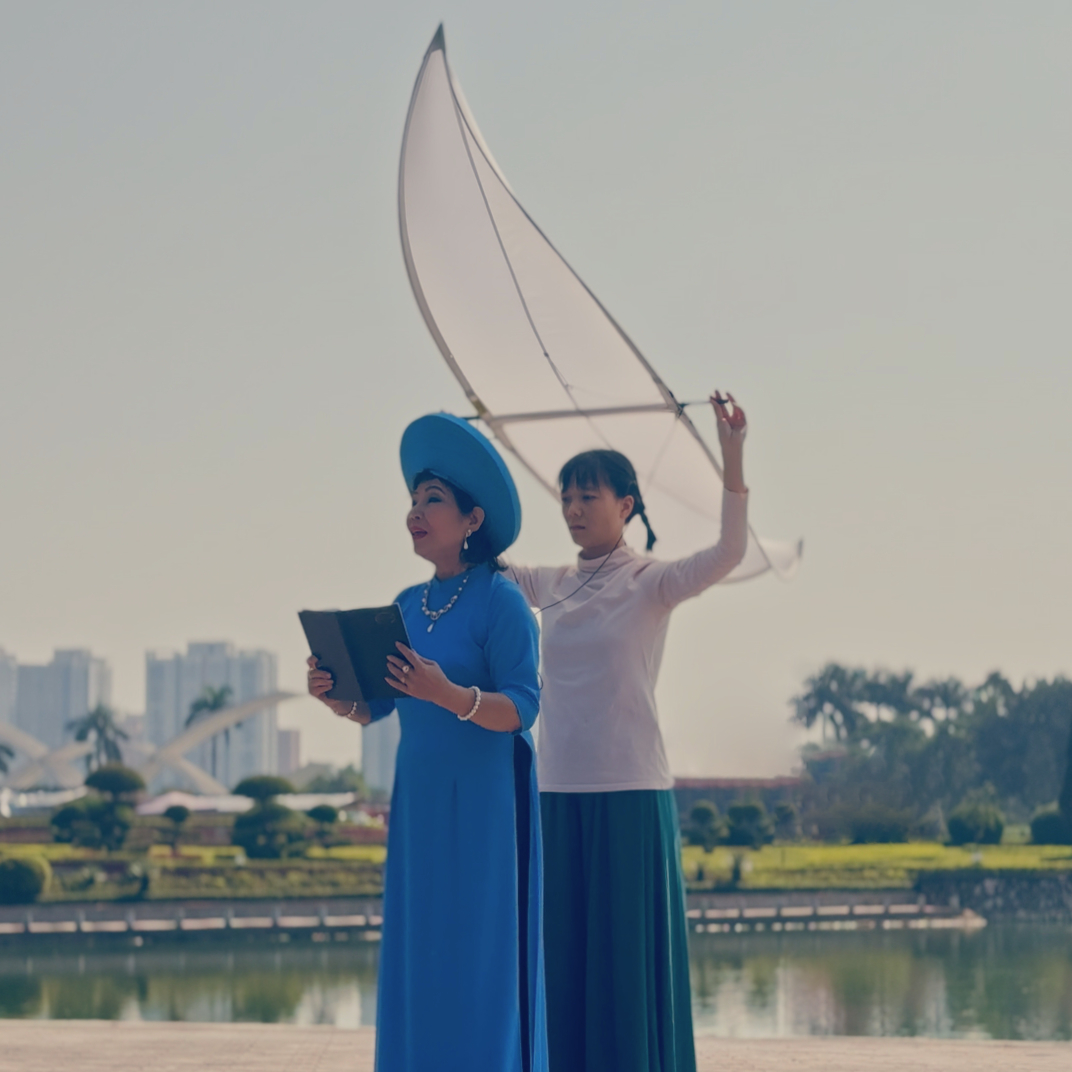 The deliberate use of traditional Vietnamese style of reciting poetry stands in contrast with the modern landscape, dotted with high-rise buildings, in a park bordered by 8-lanes highways. The minimalistic music composed by Siedl/Cao with choreography of intentionally slow movements created an atmosphere with slower time feeling.