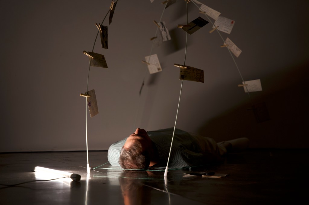 Music theater in 5 acts for 2 performers, percussion, DIA projector, voice, postcard sculpture, electronics, choreographed movement, poems, light and objects