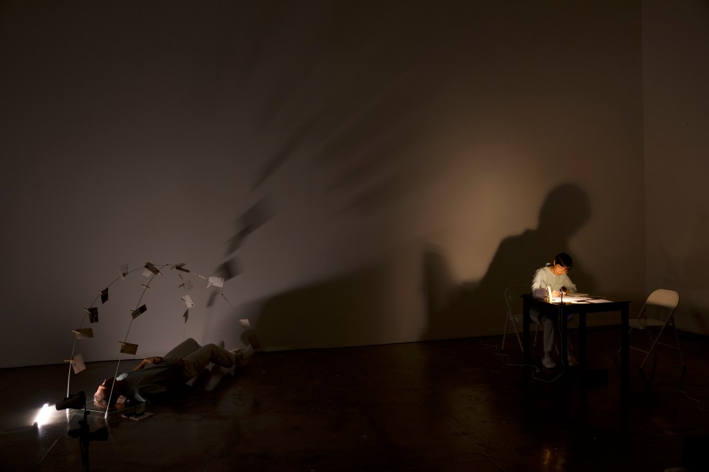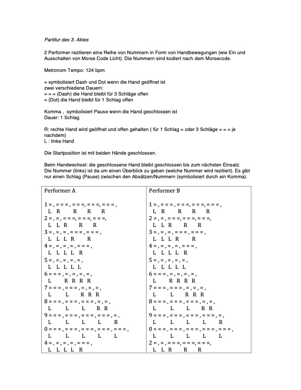 The process through which the music theatre comes into shape is through multiple ways of translating and encoding information – from language to Morse code, from Morse code to musical rhythm, from poem to number, from number to Morse code, from Morse code to body choreography, etc.